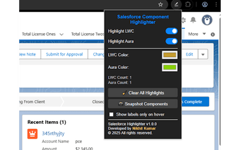 مُميز مكون Salesforce هو إضافة مجانية لمتصفح Chrome مصممة للمطورين والمديرين والمعماريين الذين يعملون مع Salesforce. يسمح للمستخدمين بتسليط الضوء على مكونات Aura و Lightning Web (LWC) مباشرة على صفحات Lightning و Classic و Experience Cloud، مما يوفر مساعدة بصرية لفحص وتصحيح والتحقق من واجهات المستخدم بشكل أكثر كفاءة. تشمل الميزات الرئيسية الكشف الفوري عن المكونات، وألوان تسليط الضوء القابلة للتخصيص، واستمرارية ذكية تحافظ على تسليط الضوء نشطًا أثناء تنقل المستخدمين عبر علامات التبويب الفرعية.